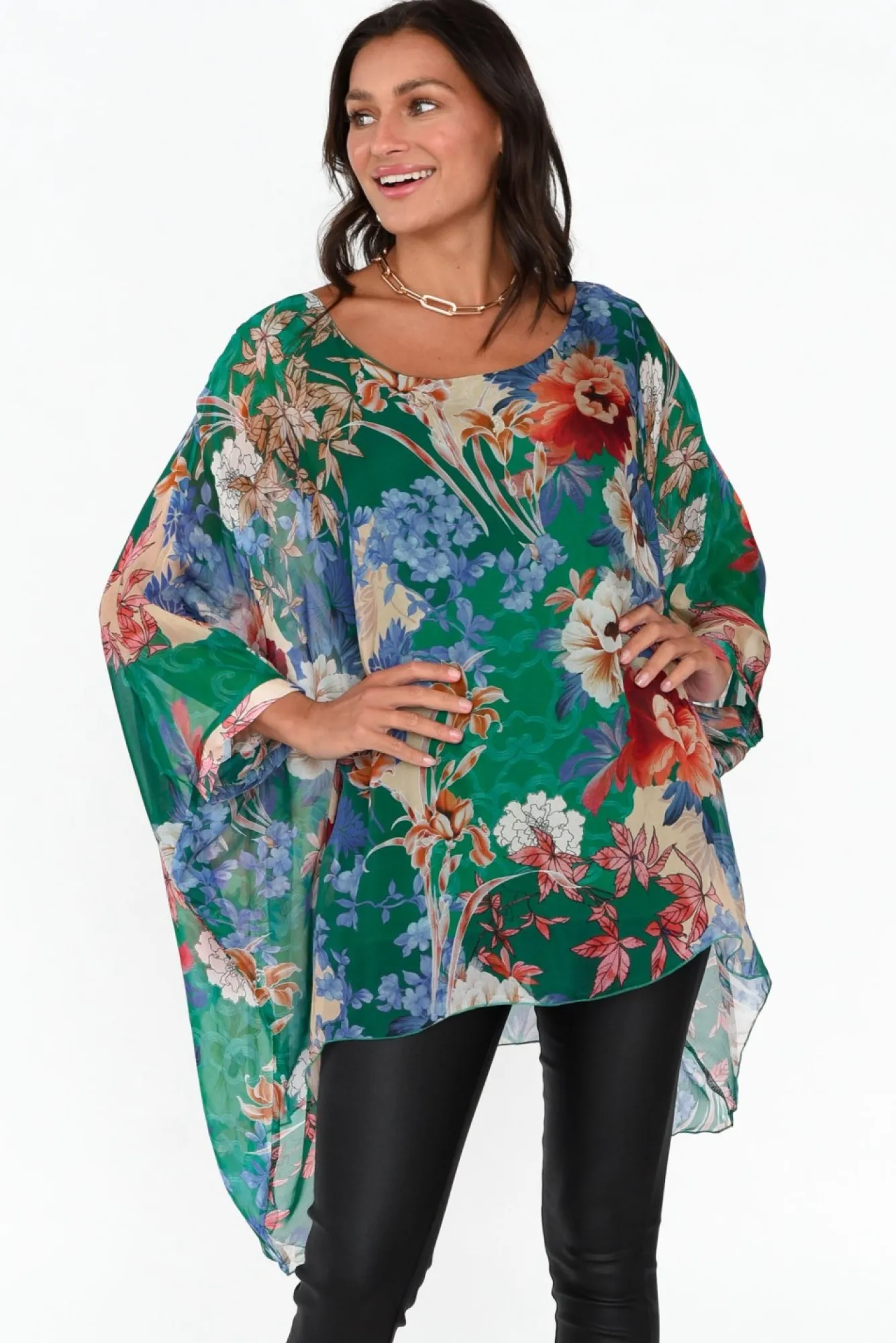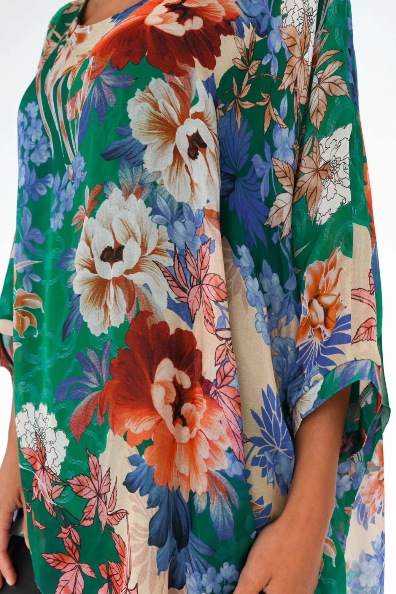 Fit: True To Size. Refer To Size & Fit Tab Below For Specific Size RecommendationNNfabric: Outer: 70% Viscose, 30% Silk Lining: 93% Cotton, 7% Elastane Nlightweight, Breezy And Non-Stretch Silk Blend Fabric With An Elevated Sheen Nfeaturing A Full Singlet Lining Made From Stretchy And Soft Cotton Blend Fabric Nwide Boatneck Highlights The Collarbones NNdramatic Sheer Batwing Sleeves Falls Past The Elbow NNelegant Drape Silhouette Cascades Below Hip Length NNfalls Below Hip Length NNNcare: Cool Gentle Hand Wash RecommendedNNcolour: Emerald Green Base With A Delicate Floral Overlay