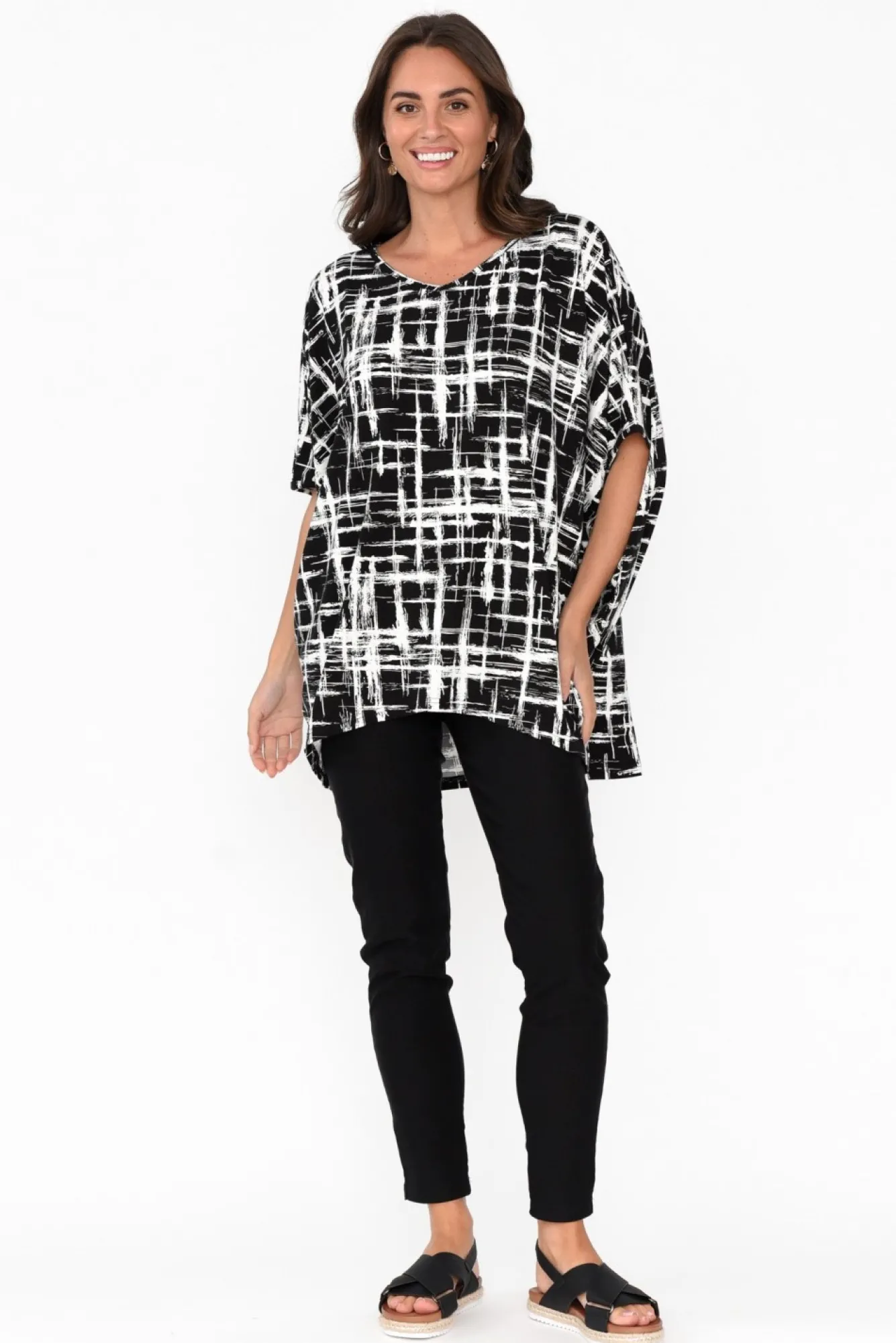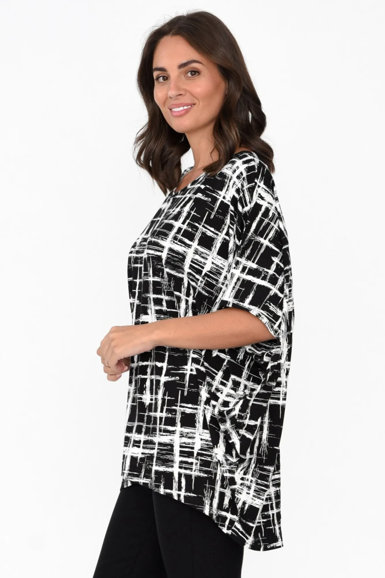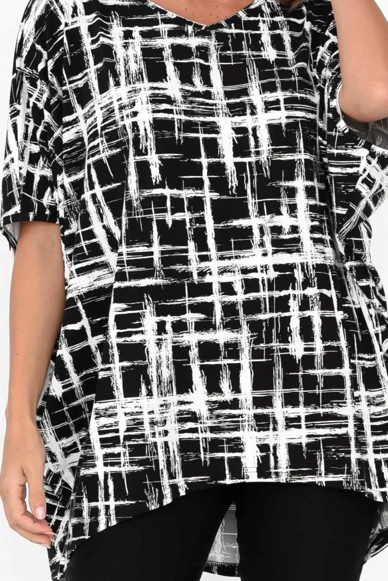 Fit: True To Size. Refer To Size & Fit Tab Below For Specific Size RecommendationNNfabric: 95% Bamboo, 5% ElastaneNultra-Soft Bamboo Fabric Offering Wonderful Thermo-Regulating, Moisture-Wicking And Hypoallergenic Properties Nsoft V-Neckline Frames The Collarbones NNbatwing-Style Half-Length Sleeves NNeffortless Drape Silhouette Ndramatic Hi-Lo Hemline Falls Below Hip LengthNNcare: Cool Gentle Hand Wash RecommendedNNcolour: Eye-Catching White Brush Print Over A Black Base