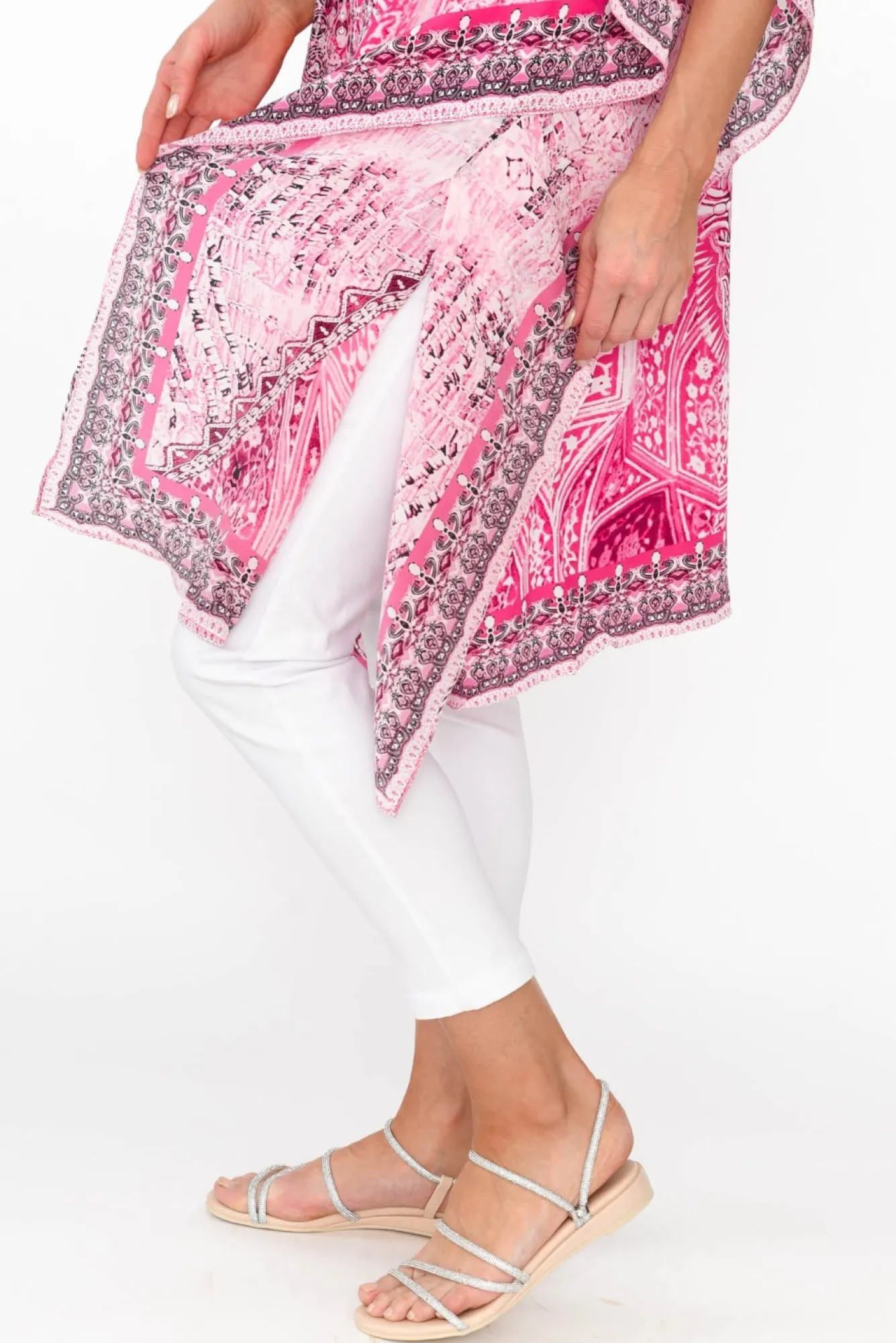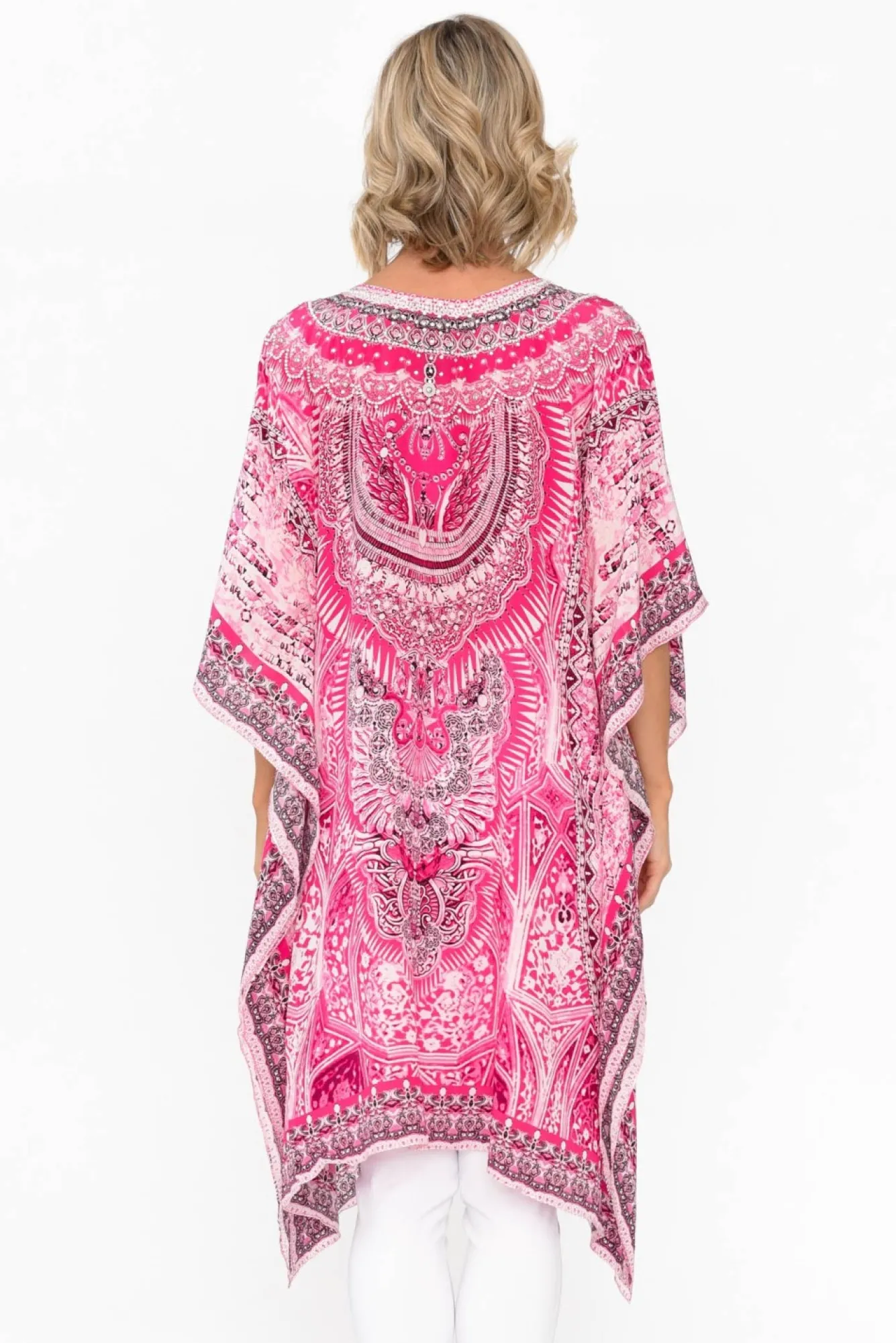Fit: One Size. Refer To Size & Fit Tab Below For Specific Size RecommendationNNfabric: 100% SilkNa Fabulous Lightweight, Non-Stretch Silk GarmentNv-Neckline With Beaded Sparkle EmbellishmentsNkaftan Drape Style Shape Creating The Ultimate Floaty Summer EssentialNbatwing Style Sleeves With Stunning Waterfall DrapeNdesign Falls To The KneeNNNcare: Specialist Dry Clean OnlyNNcolour: Intricate Boho Style Print In Hues Of Hot PinkNNNstyle Tip: Wear As A Dress Or Style Over Pants For A Tunic Look!