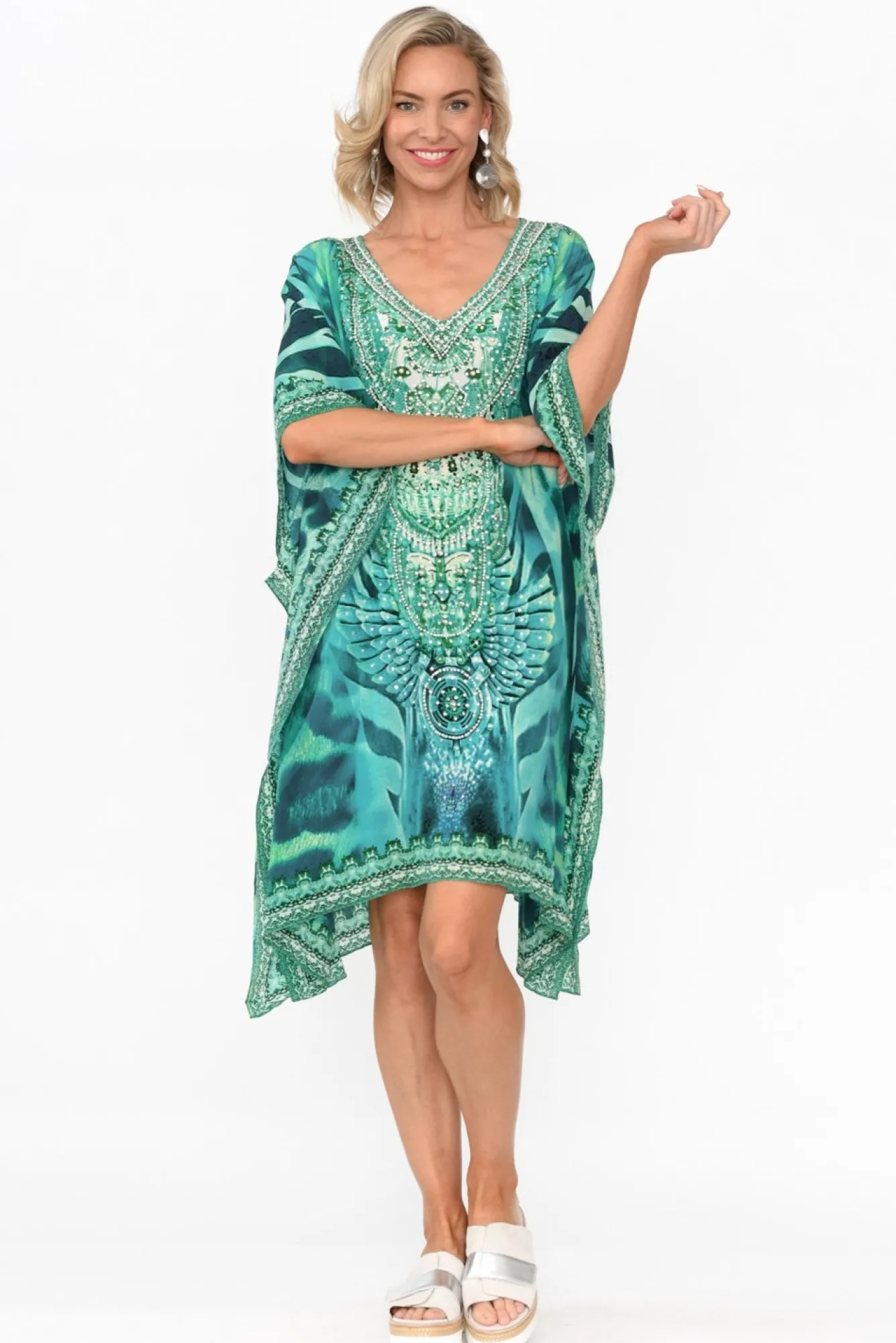 Fit: One Size. Refer To Size & Fit Tab Below For Specific Size RecommendationNNfabric: 100% SilkNa Fabulous Lightweight, Non-Stretch Silk GarmentNv-Neckline With Beaded Sparkle EmbellishmentsNkaftan Drape Style Shape Creating The Ultimate Floaty Summer EssentialNversatile Design, Style Over Pants To Create A Tunic Look!NNbatwing Style Sleeves With Stunning Waterfall DrapeNdesign Falls To The KneeNNNcare: Specialist Dry Clean OnlyNNcolour: Gorgeous Abstract Print In Hues Of Aqua