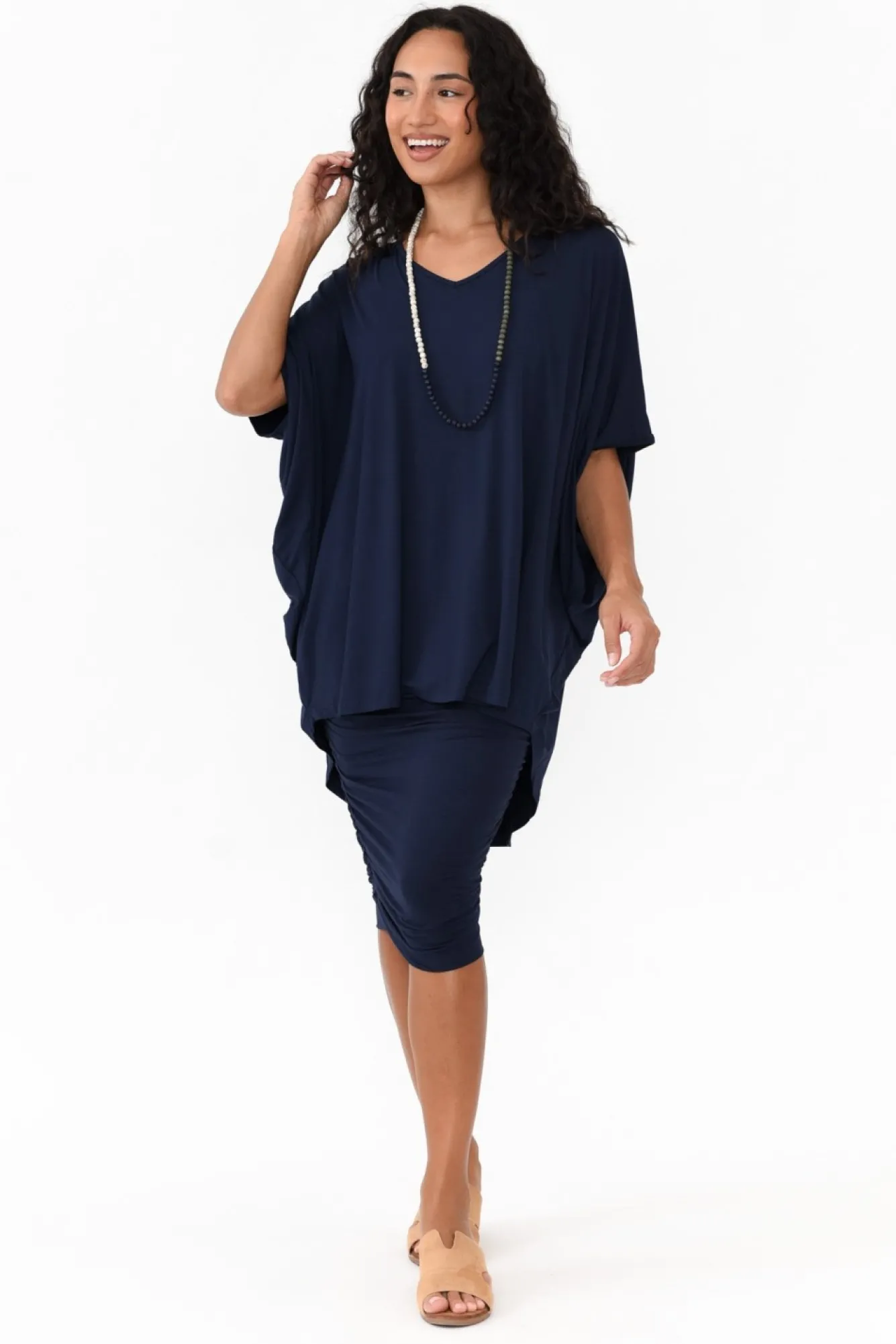Fit: Oversized. Refer To Size & Fit Tab Below For Specific Size Recommendation NNfabric: 95% Bamboo Viscose, 5% SpandexNthe Finest, Lightweight Bamboo Design Featuring Ultra Soft Stretch And Breathability Nv-NecklineNelbow-Length Batwing SleevesNNcurve-Enhancing Draped Batwing SilhouetteNhip Skimming LengthNhi-Lo HemlineNNcare: Cool Gentle Machine Wash RecommendedNNcolour: Navy Blue Hue