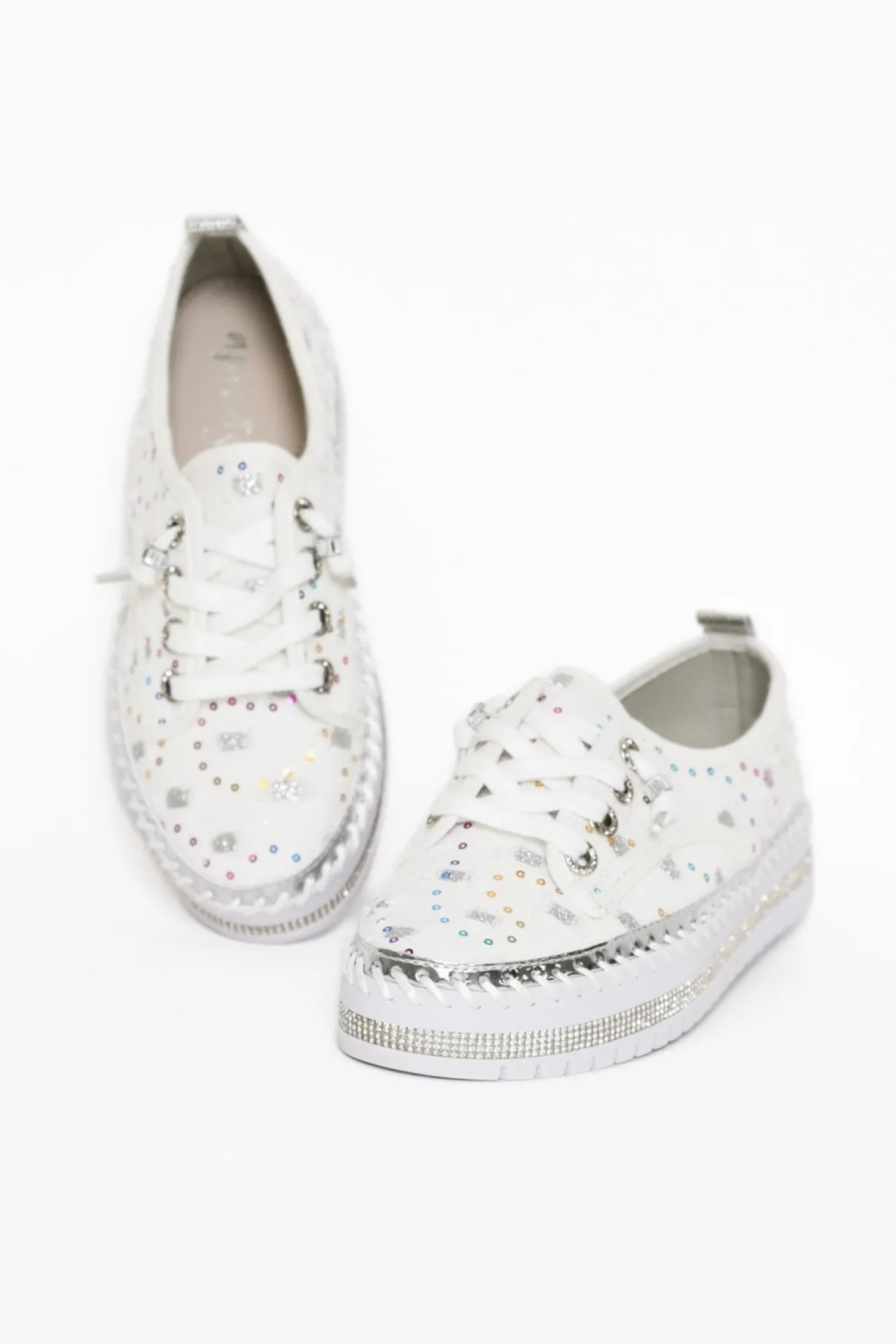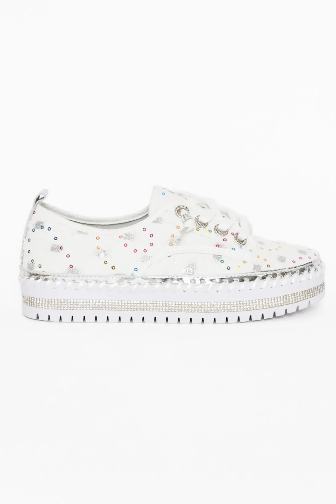 True To Size: Pick The Size You Would Normally Buy NN Fit: Standard – Wide Nstatement Platform Sneaker Sure To Elevate Any Outfit Nwhite Laces Reinforced With A Bead For An Easy Slip-On Style – No Tying Laces!Nglitter Patches With Distressed Details And Sequins Adorn The White Upper Npadded Insole For ComfortNstrip Of Diamantes On The Base Of The Shoe And Thick Exposed Stitching Detailing For An Extra Stylish TouchNchunky Platform Heel With Grooved Tread Enhancing Flexibility And GripNNupper: SyntheticNNlining: SyntheticNsole: SyntheticNheel Height: 3.2Cm Nshoe Care: Use A Water And Stain Repellent Spray To Protect Before Wearing. To Clean Use A Damp Cloth And Spot Clean.Nincludes A Small Bag Of Replacement Sequin To Keep Your Shoes Shining Bright!