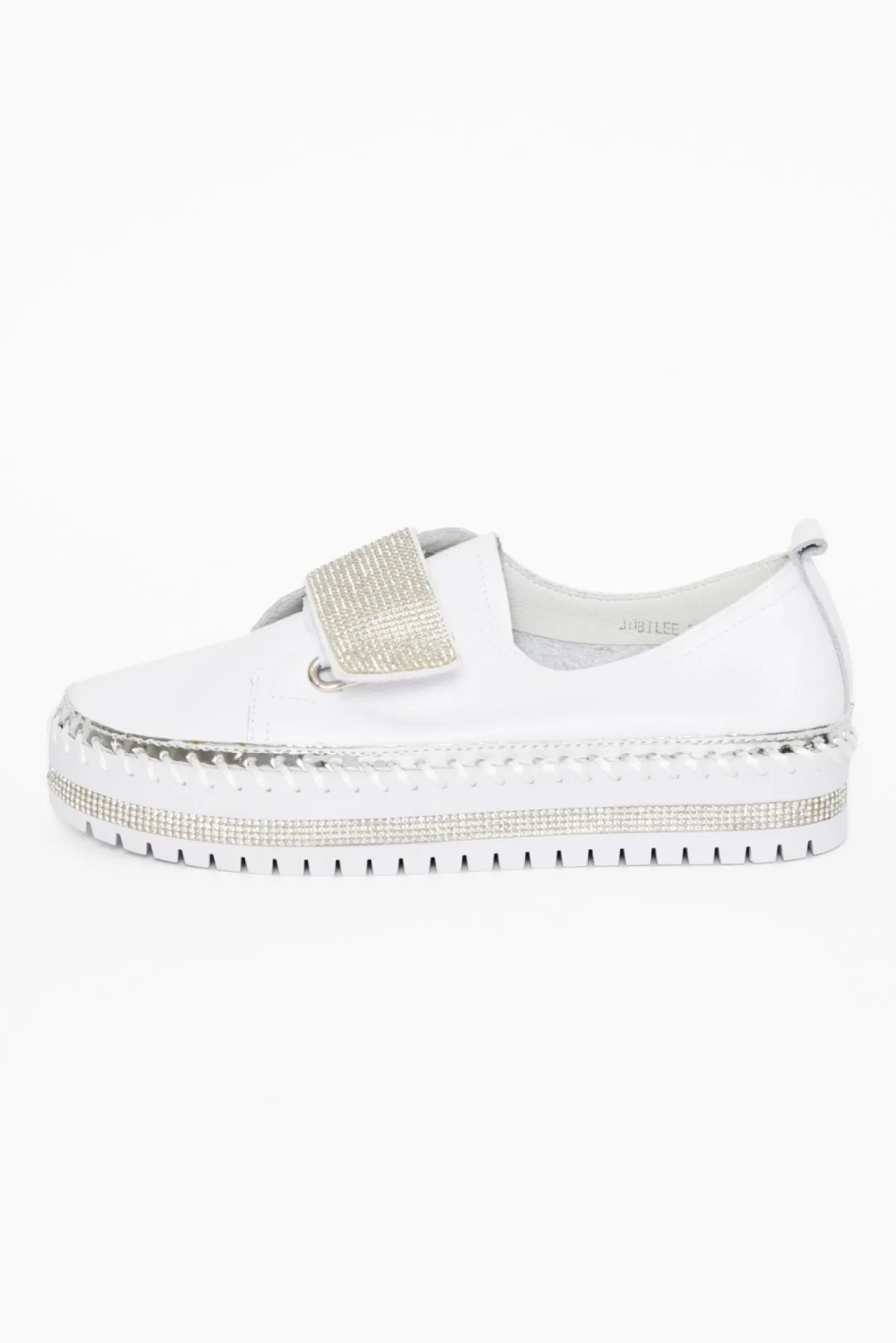 True To Size: Pick The Size You Would Normally BuyNNfit: Standard – WideNchic Platform Sneaker With A Bedazzled Velcro Strap For Easy Slip-On And Off Nstrip Of Diamantes On The Base Of The Shoe And Thick Exposed Stitching Detailing For An Extra Stylish TouchNpadded Insole For ComfortNribbed Sole Prevents Slips And FallsNNupper: SyntheticNNlining: SyntheticNsole: SyntheticNheel Height: 3.3CmNcolour: Classic WhiteNshoe Care: Use A Water And Stain Repellent Spray To Protect Before Wearing. To Clean Use A Damp Cloth And Spot Clean.Nincludes A Small Bag Of Replacement Sequin To Keep Your Shoes Shining Bright!